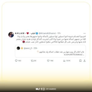 أعربت الفنانة أحلام عن غضبها بسبب تدوينة من أحد متابعي الفنانة أصالة، أشار فيها إلى أن جمهور أحلام ينهار وفي المقابل تزداد شعبية أصالة، مما أدي ذلك بأنزعاج النجمة الإمارتية ودفعها للرد بشكل قوي ك لكل من حاول ان يصطاد بالماء العكر بينهما.
