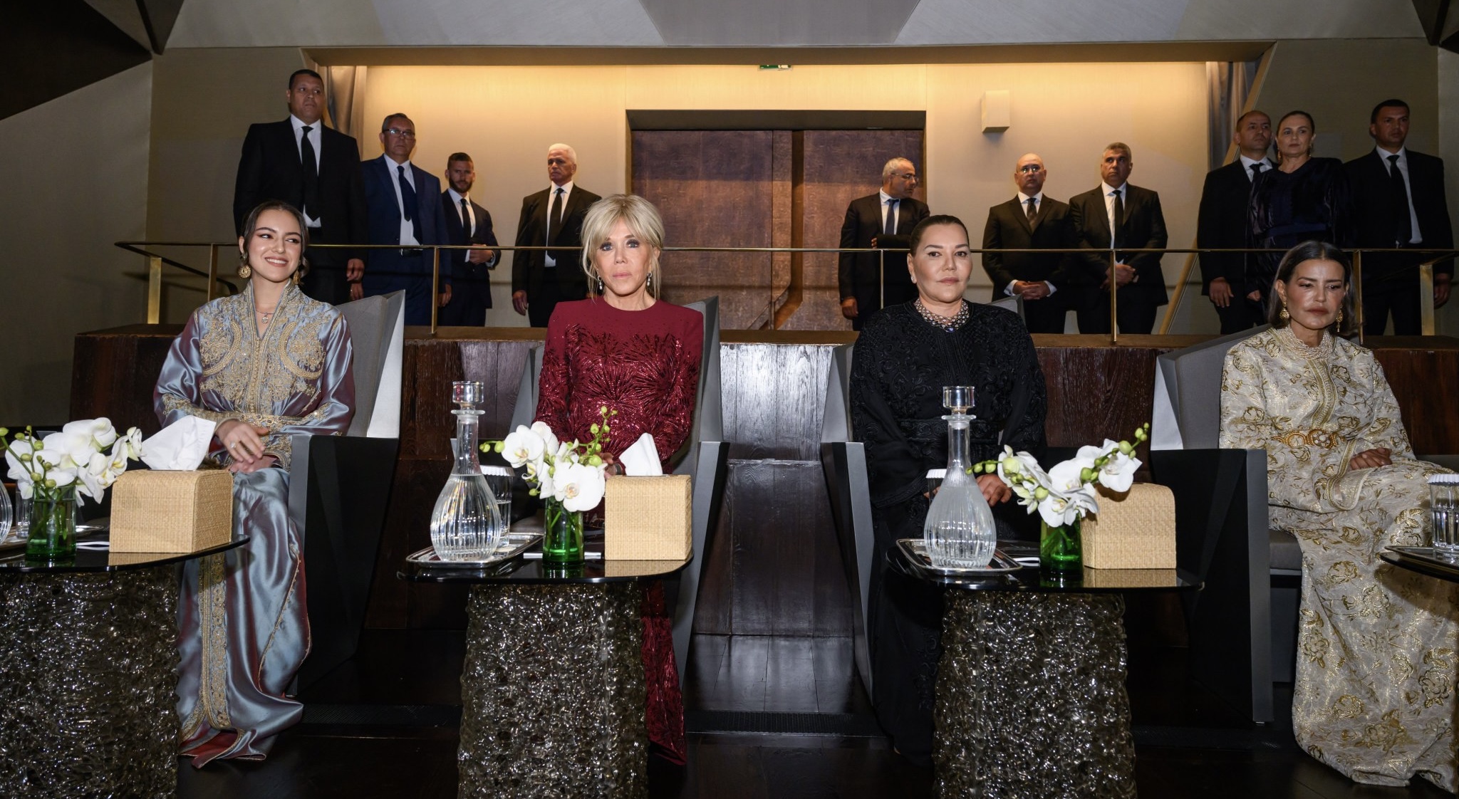 وفي ختام هذا العرض، تقدم للسلام على صاحبات السمو الملكي الأميرات للا خديجة، وللا مريم، وللا حسناء، رفقة السيدة بريجيت ماكرون، كل من السيدة سميرة قادري، مغنية السوبرانو، والسيدة حليمة محمدي، مغنية الميزو-سوبرانو، ودينا بن سعيد، قائدة أوركسترا وعازفة البيانو، والسيد مروان بن عبد الله، عازف بيانو، والسيد إدريس الملومي، الملحن وعازف العود، والسيد يونس ترفاس، مدير الأوركسترا السيمفونية الملكية.